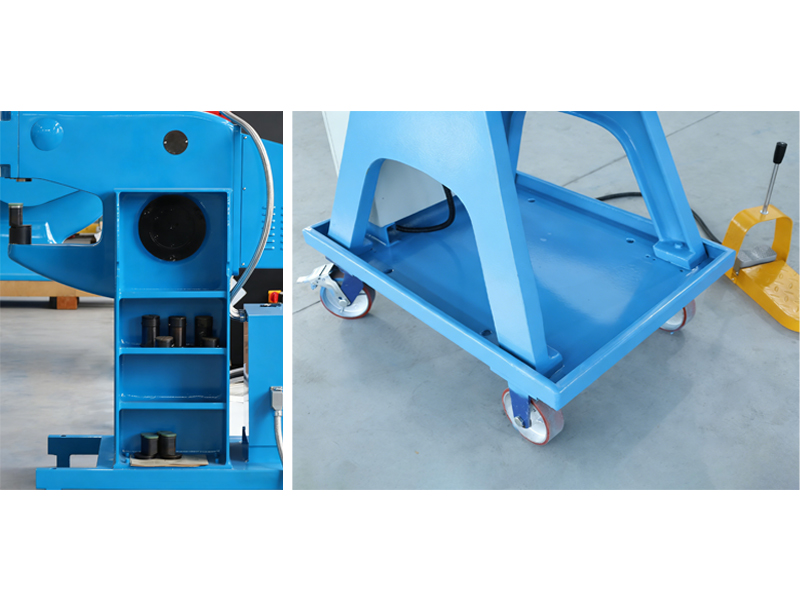 Armoire surdimensionné en option stocke des matrices et des pièces détachées pour des changements plus rapides. Les roulettes pivotantes permettent un déplacement et un verrouillage rapides; la zone de roulette double de stockage temporaire pour les échanges d'outillage sur place.