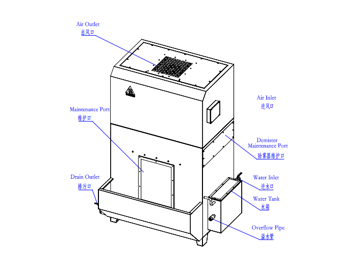 Sous la pression négative créée par le ventilateur, le gaz chargé de poussière pénètre dans le module de filtration d'eau et entre en contact étroit avec le liquide (généralement l'eau). Grâce à l'impact inertiel entre les gouttelettes d'eau et les particules de poussière et d'autres mécanismes de collecte, le dispositif capture efficacement les particules liquides ou solides avec des diamètres dans le3 à 30 μmgamme et élimine également certains polluants gazeux. L'eau est entraînée vers le haut par le flux de gaz; en combinaison avec l'unité de décomposition et de désamorçage, la séparation gaz-liquide se produit et le liquide retourne dans le réservoir, ce qui permetRecirculation d'eau sans pompeLe système atteint une efficacité de purification de ≥90% pour les particules supérieures à 10 μm.